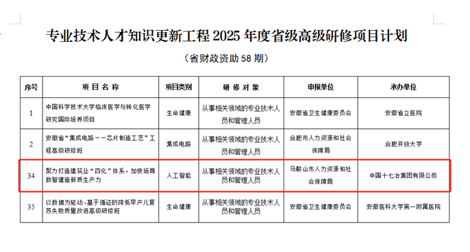近日,安徽省人力資源和社會(huì)保障廳下發(fā)了《關(guān)于印發(fā)專業(yè)技術(shù)人才知識(shí)更新工程2025年國(guó)家級(jí)和省級(jí)高級(jí)研修項(xiàng)目計(jì)劃的通知》(皖人社函〔2025〕225號(hào)),中國(guó)十七冶申報(bào)的《聚力打造建筑業(yè)“四化”體系,加快培育數(shù)智建造新質(zhì)生產(chǎn)力》成功入選項(xiàng)目計(jì)劃,并獲得省級(jí)財(cái)政資助。