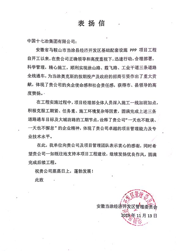 11月20日,從當涂經(jīng)濟開發(fā)區(qū)管理委傳來表揚信,對中國十七冶集團交通工程技術(shù)分公司承建的安徽省馬鞍山市當涂縣經(jīng)濟開發(fā)區(qū)基礎(chǔ)配套設(shè)施項目順利實現(xiàn)涂山路、霞飛路、工業(yè)干道三條道路全線通車予以高度贊揚。
