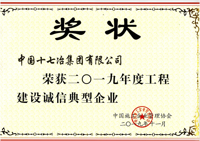12月9日,中國十七冶集團收到中國施工企業(yè)管理協(xié)會頒發(fā)的榮譽證書,公司“工程建設AAA信用等級”復審通過,并被授予“2019年度工程建設誠信典型企業(yè)”榮譽稱號。