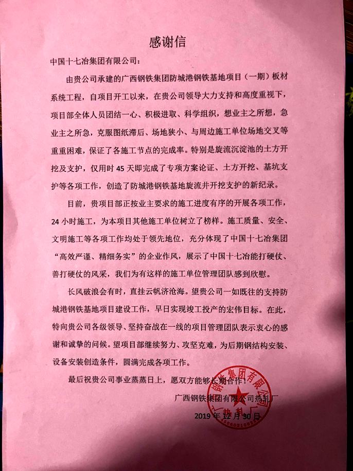 12月30日,中國十七冶集團收到廣西鋼鐵集團熱軋廠發(fā)來的感謝信,對冶金工程技術分公司項目部管理團隊保質保量完成各項節(jié)點目標給予高度贊譽。