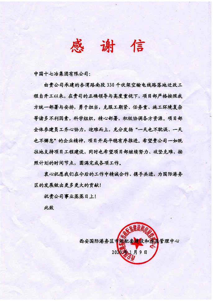 1月9日,中國十七冶集團收到西安國際港務區(qū)市政配套建設和房屋管理中心發(fā)來的感謝信,對路橋工程技術分公司承建的西安東北部330KV架空線路落地遷改電纜工程杏渭路(北三環(huán)-潘騫路)電纜隧道工程取得的進展表示衷心感謝。