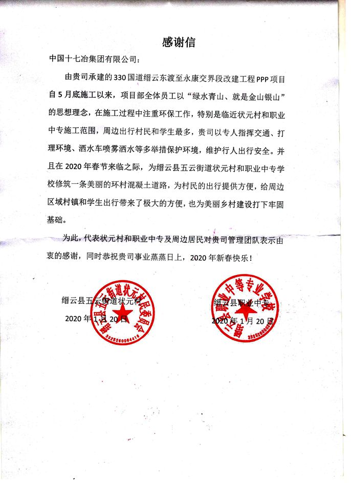 1月20日,縉云縣五云街道狀元村民委員會、職業(yè)中等專業(yè)學(xué)校向中國十七冶集團有限公司發(fā)來感謝信,感謝路橋工程技術(shù)分公司330國道縉云東渡至永康交界段改建工程PPP項目部為狀元村和職業(yè)中等專業(yè)學(xué)校修筑了一條美麗的環(huán)村混凝土道路,為村民和學(xué)生的出行提供了極大的便利。
