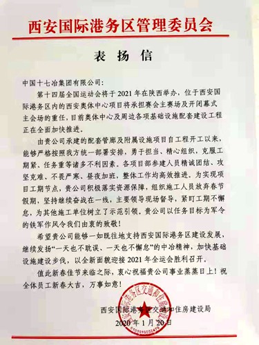 1月22日,中國(guó)十七冶集團(tuán)收到西安國(guó)際港務(wù)區(qū)交通和住房建設(shè)局發(fā)來的表揚(yáng)信。