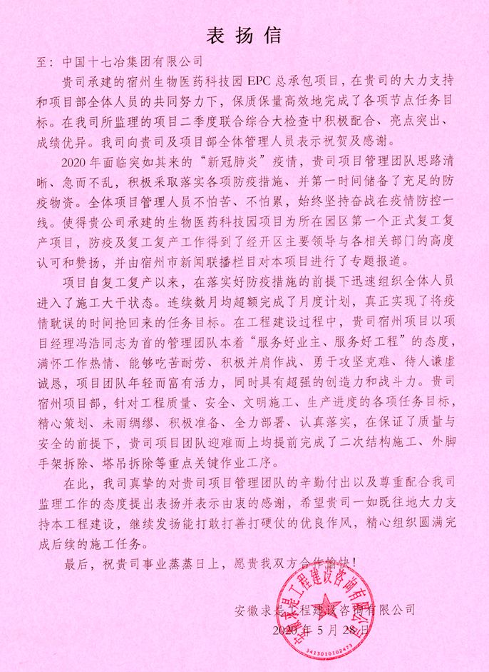 5月29日,安徽求是工程建設咨詢有限公司向中國十七冶集團致表揚信,對中國十七冶集團在承建宿州生物醫(yī)藥科技園項目進程中“高效嚴謹、精細務實”的企業(yè)作風給予高度贊揚。