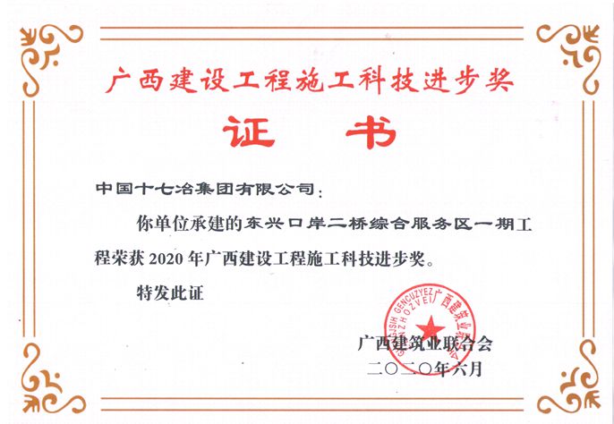 6月15日,中國十七冶集團東興國門項目收到廣西建筑業(yè)聯(lián)合會頒發(fā)的“廣西建設(shè)工程施工科技進步獎”榮譽證書。