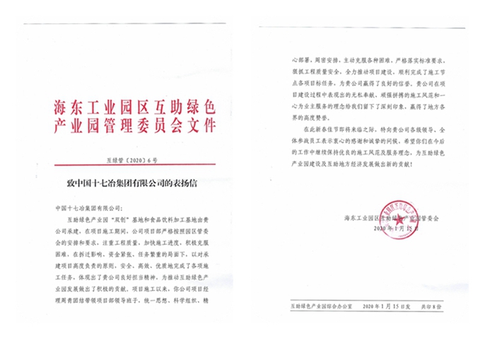 1月16日,青海省海東工業(yè)園區(qū)互助綠色產(chǎn)業(yè)園管理委員會(huì)向中國十七冶集團(tuán)發(fā)來感謝信,對甘肅分公司承建的青?;ブG色產(chǎn)業(yè)園“雙創(chuàng)”基地項(xiàng)目和食品飲料加工基地項(xiàng)目保質(zhì)保量完成任務(wù)提出表揚(yáng)。