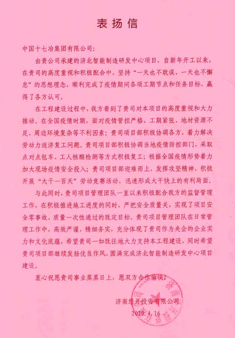 4月20日,中國十七冶集團(tuán)收到濟(jì)南經(jīng)開投資有限公司發(fā)來的表揚(yáng)信,表揚(yáng)山東分公司濟(jì)北智能制造研發(fā)中心項(xiàng)目部高度重視、積極配合,順利完成了疫情期間各項(xiàng)工期節(jié)點(diǎn)和任務(wù)目標(biāo),贏得了各方認(rèn)可。