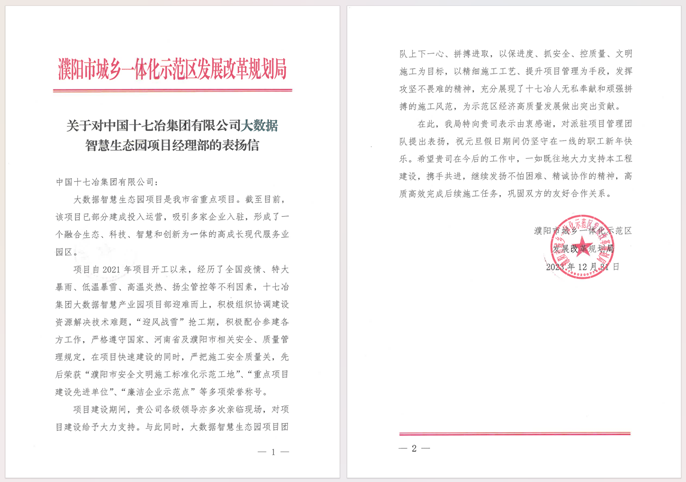 近日,濮陽市城鄉(xiāng)一體化示范區(qū)發(fā)展改革規(guī)劃局向中國十七冶集團(tuán)致表揚(yáng)信,對冶金分公司大數(shù)據(jù)智慧生態(tài)園項(xiàng)目高質(zhì)量完成年度建設(shè)任務(wù)表示感謝。
