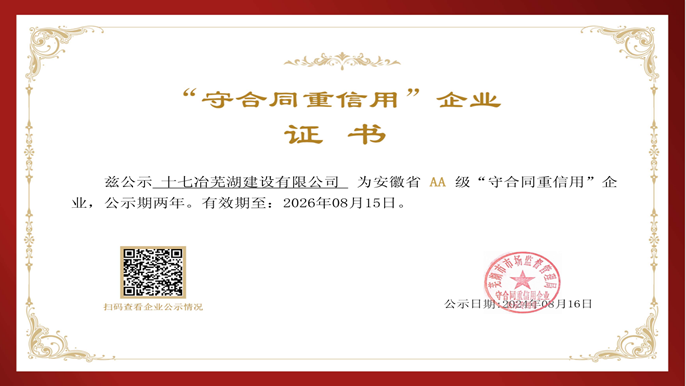 8月16日,從安徽省市場監(jiān)督管理局獲悉,十七冶蕪湖建設(shè)有限公司獲評(píng)安徽省AA級(jí)“守合同重信用”企業(yè),公示期兩年。