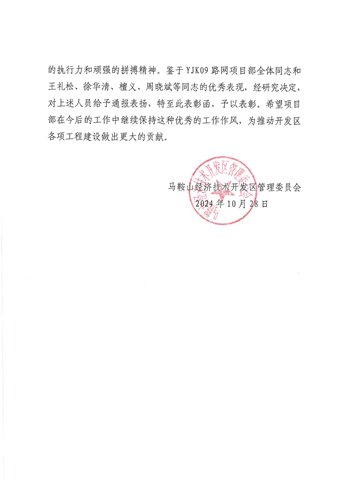 10月28日,馬鞍山經(jīng)開(kāi)區(qū)管委會(huì)向中國(guó)十七冶致表彰函,對(duì)經(jīng)開(kāi)區(qū)銀塘單元路網(wǎng)項(xiàng)目真抓實(shí)干,積極對(duì)接經(jīng)開(kāi)區(qū)入駐企業(yè)需求,按期保質(zhì)完成明珠路雨污水管道施工任務(wù),確保企業(yè)投產(chǎn)、管線投用致以感謝。