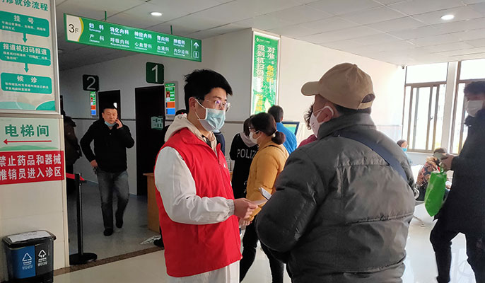 一大早,醫(yī)院團(tuán)員、青年志愿者,披上紅馬甲,兩人一組,分散在醫(yī)院門診、住院、體檢中心等人流較多的場所,做起了志愿勸導(dǎo)員。這些志愿者來自機(jī)關(guān)、門診及部分臨床科室,他們在各個(gè)樓層間來回巡視,勸導(dǎo)排隊(duì)掛號(hào)、繳費(fèi)、就診的病人前后保持一米以上的距離;對(duì)于未規(guī)范戴口罩的病人及家屬,做出有效指正,并對(duì)患者的問題給與解答??谡终谧〉氖潜砬椋瑓s遮不住志愿者的熱情。這些團(tuán)員、青年志愿者用積極主動(dòng)的服務(wù)在疫情形勢嚴(yán)峻的當(dāng)下溫暖了前來就診的群眾。