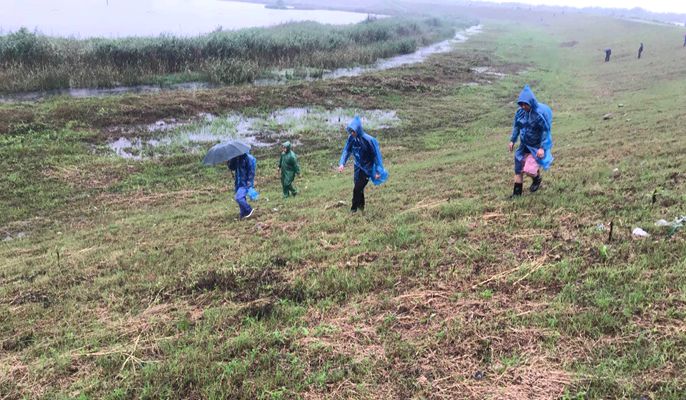 隊(duì)員們冒雨行走在泥濘的背水坡上,五人一組站成一排,逐段逐段的仔細(xì)巡查著坡面,每隔一個(gè)小時(shí)進(jìn)行一次排查,不大意不松懈,不錯(cuò)過(guò)任意一個(gè)可能發(fā)生滲漏的點(diǎn)。薄底的膠鞋走在堆滿各類尖銳石子的背水坡,腳底生疼,但大家都咬牙堅(jiān)持,腳底磨出一個(gè)個(gè)水泡。累了大家就在橋洞底、路邊的臨時(shí)休息點(diǎn)休息一會(huì),簡(jiǎn)單的吃個(gè)午飯,繼續(xù)巡查。