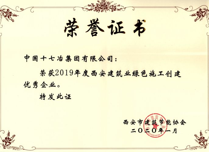 4月3日下午,中國十七冶集團(tuán)收到西安市建筑節(jié)能協(xié)會(huì)頒發(fā)的2019年度西安建筑業(yè)綠色施工創(chuàng)建優(yōu)秀企業(yè)獎(jiǎng)證書。
